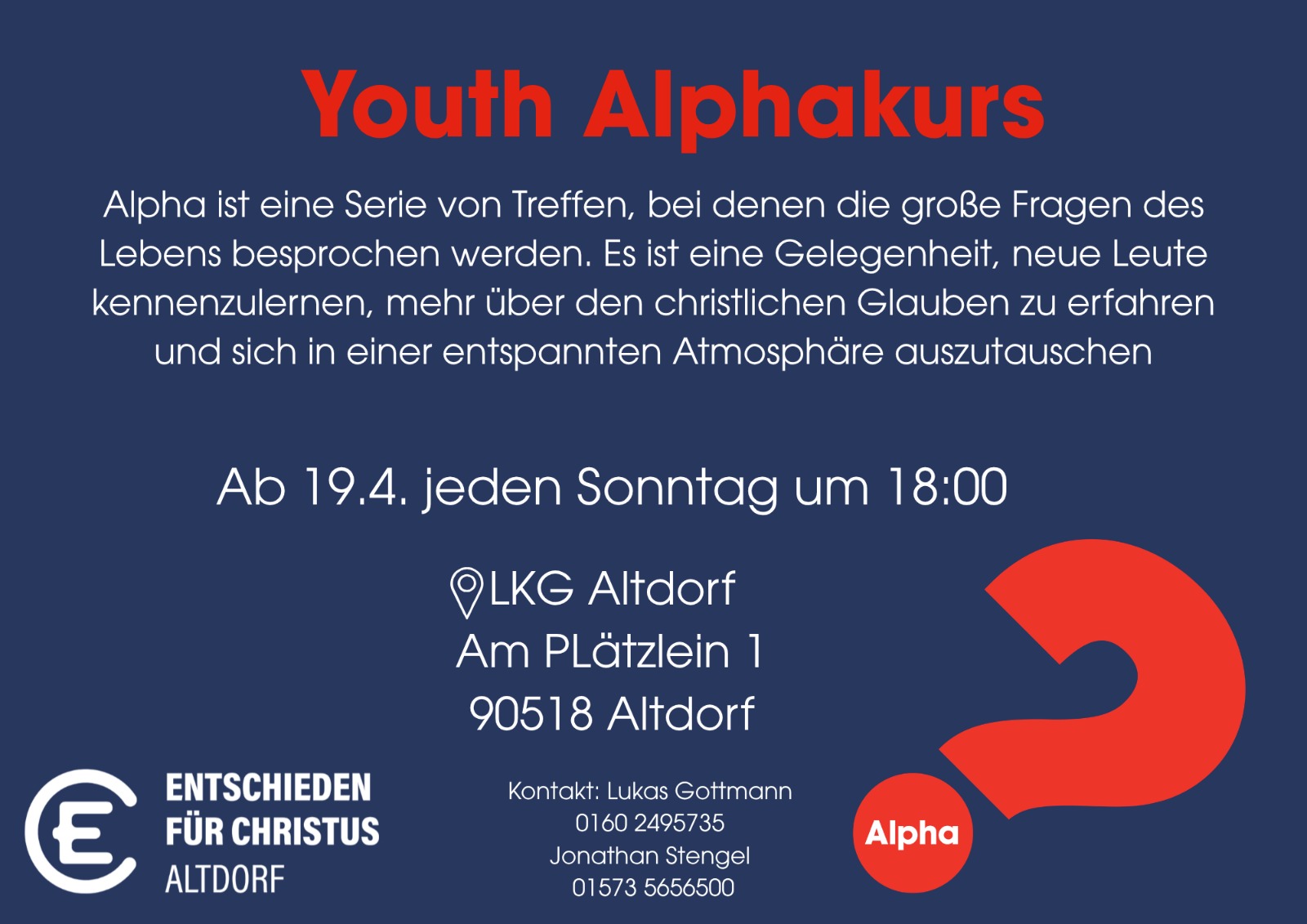 Veröffentlicht am 16. April 2026 von Claus KnittelYouth Alphakurs startet für Jugendliche ab 16 Jahren ab 19.4.2026 jeden Sonntag um 18 Uhr in der LKG Altdorf, Am Plätzlein 1, 90518 Altdorf